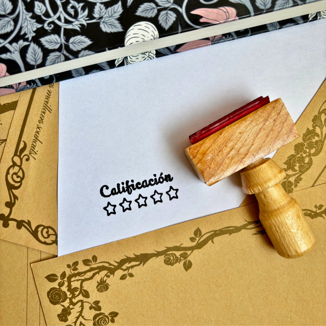 Sello de goma de medida aproximada 5x2 cm, con mango de madera, lleva la frase "Calificación" y 5 estrelllas para que las rellenes con tu plumón o pluma favorita al calificar tu libro.