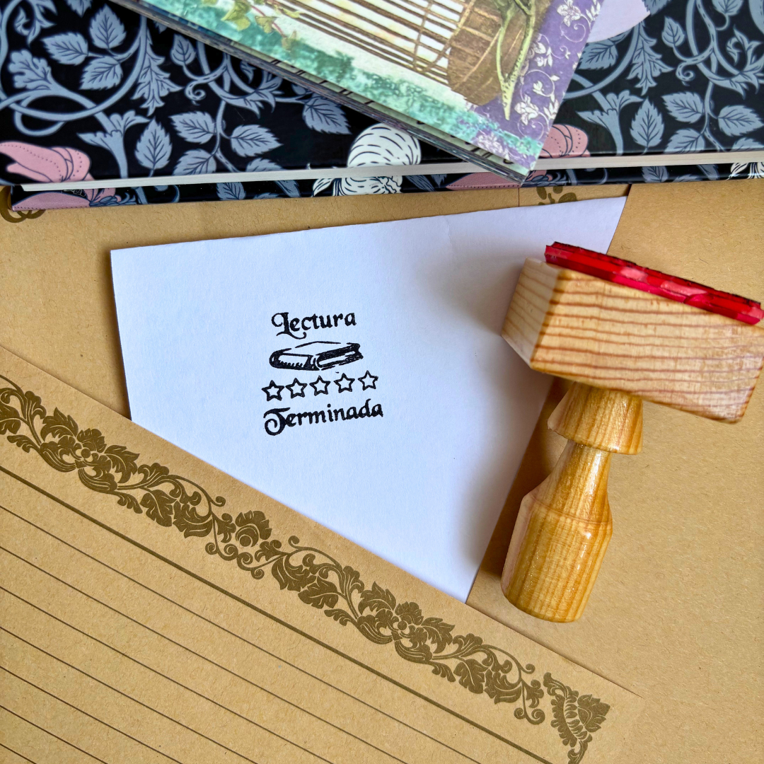 Sello de goma de medida aproximada 4x4 cm, con mango de madera, lleva la frase "Lectura terminada" y 5 estrelllas para que las rellenes con tu plumón o pluma favorita al calificar tu libro.