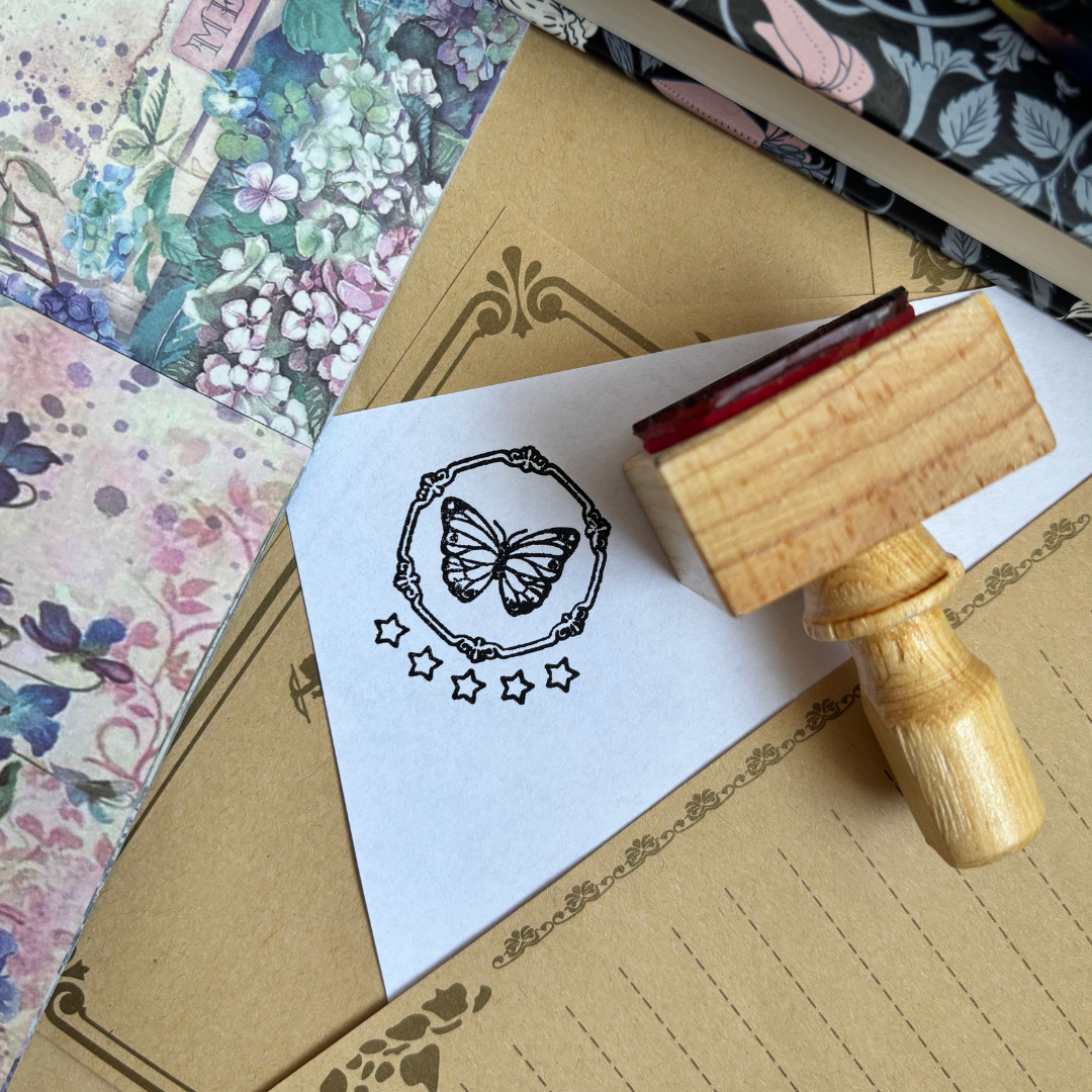 Sello de goma de medida aproximada 4x4 cm, con mango de madera, y 5 estrelllas para que las rellenes con tu plumón o pluma favorita al calificar tu libro.