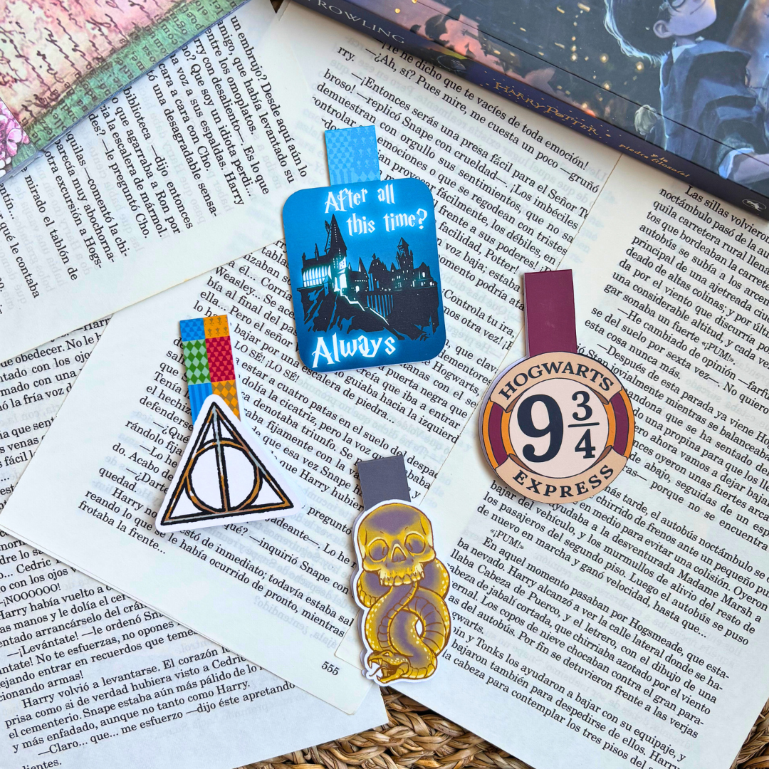 Separadores hechos artesanalmente, con materiales de calidad, ilustrados por artistas de Conjuro Literario, cada separador tiene ilustración de doble vista e incluye un imán en su interior.