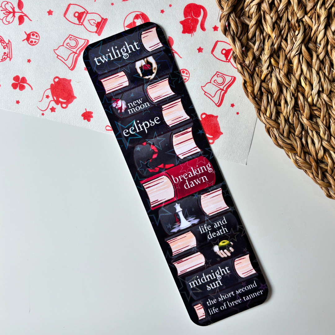 - Separador tradicional: Hermosa ilustración inspirada en todos los libros de la saga, ilustrada de un solo lado, con acabado holográfico por ambos lados.